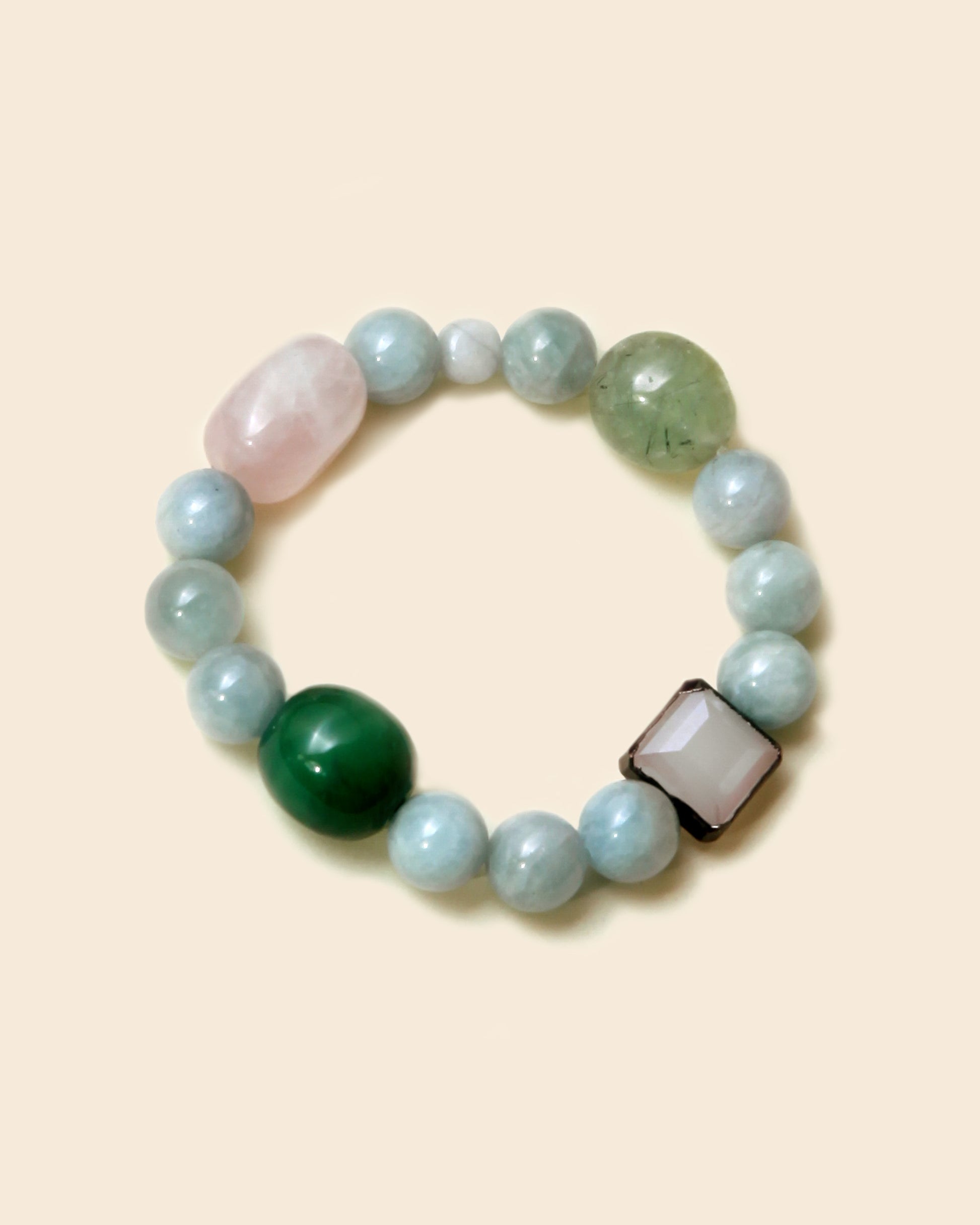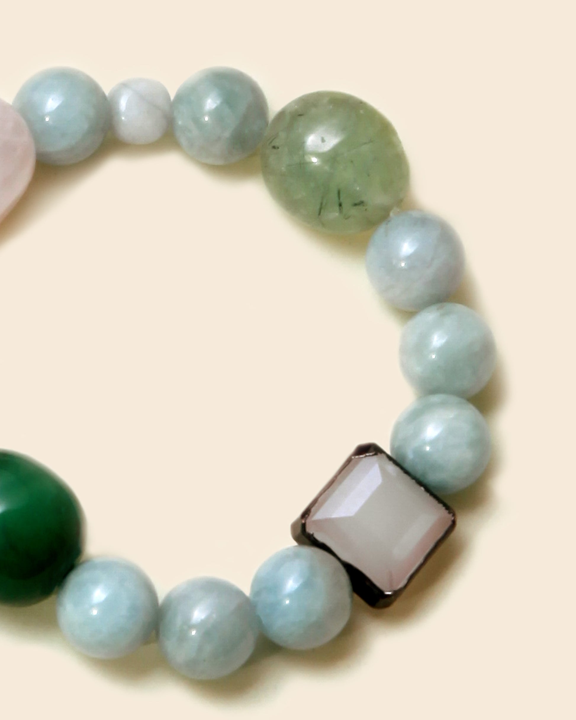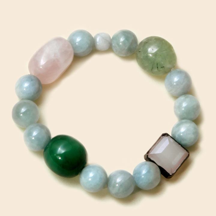 Aqua marine,Pink Rose Quartz, Jade and Prehnite oval beads with Crystal on brass accent cube.