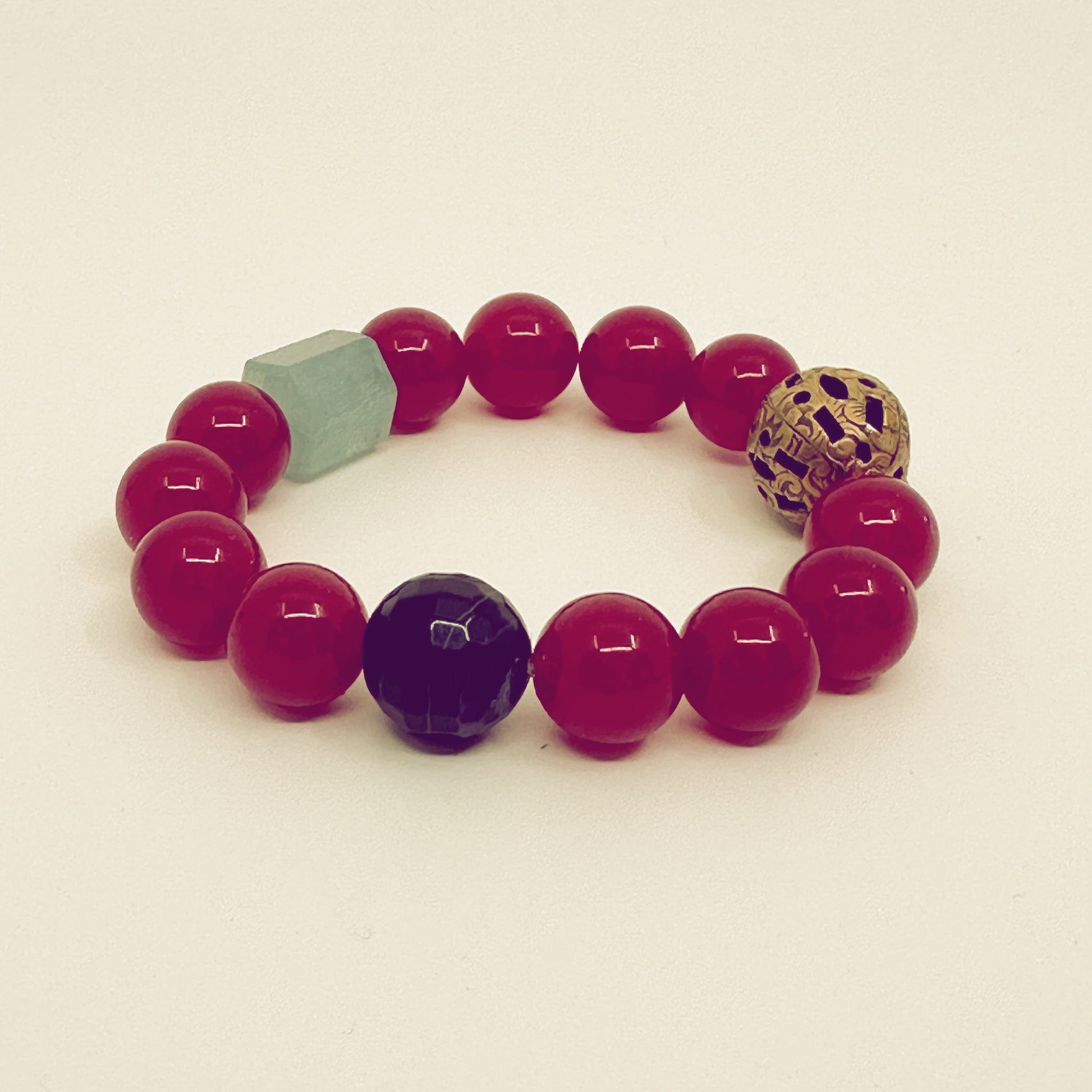 Red Agate, Amethyst , Aqua Marine Barrel, Brass Accent.
