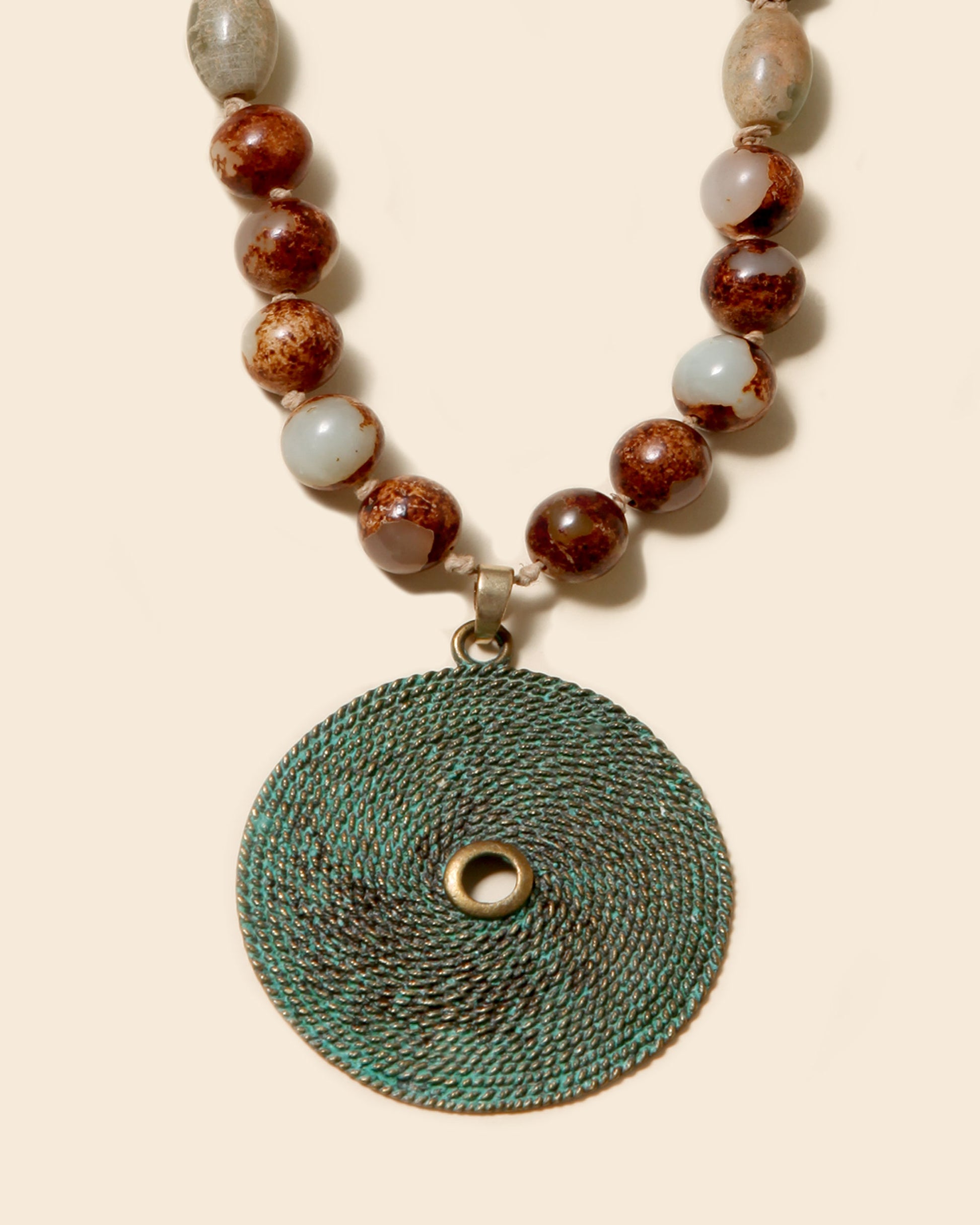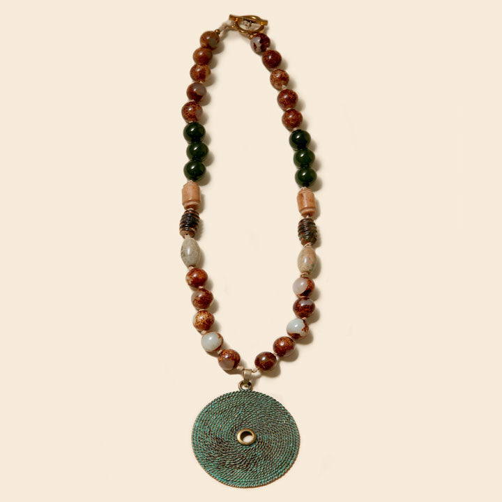 Oversize copper pendant approximately ,Antique Jade barrel cylinder , Green Jasper & Agate. Brass Clasp made on hemp.