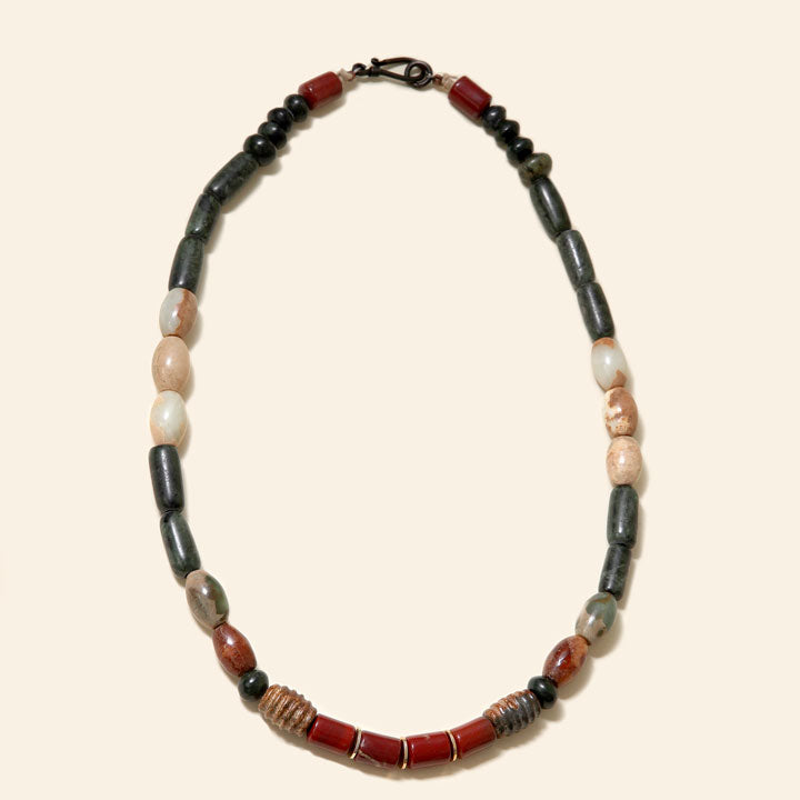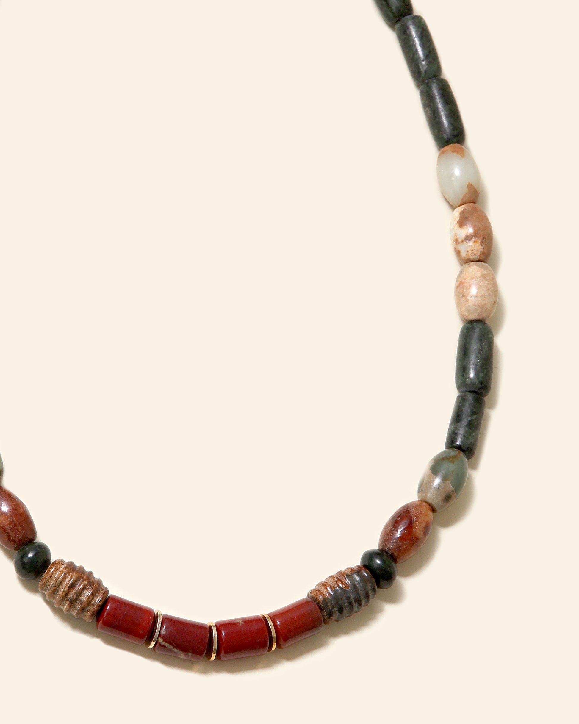 Antique Jade barrels cylinder,Dark Green Jade,Red Jasper Barrels,Jade beads, Gold Brass spacers and Antique Brass clasp.