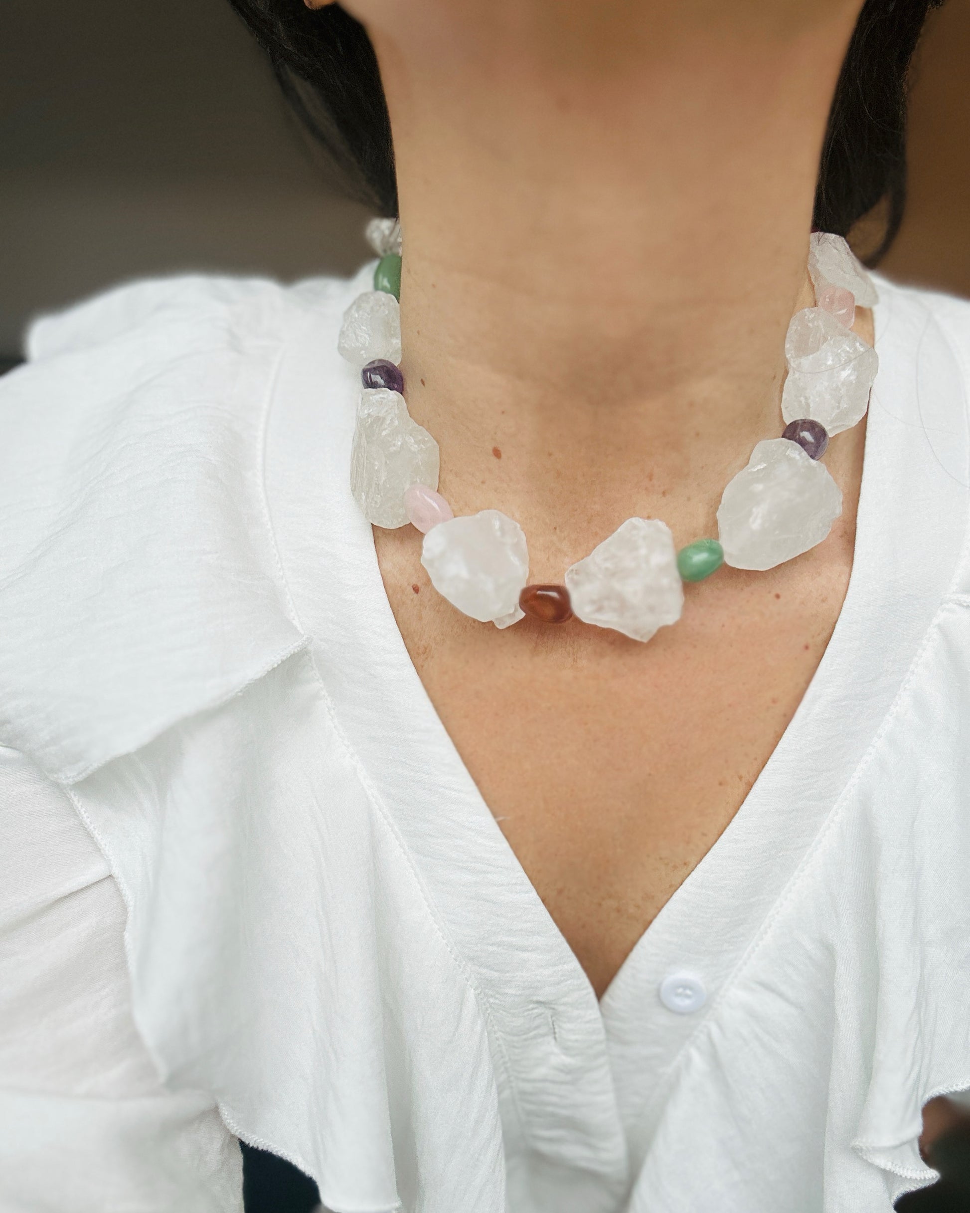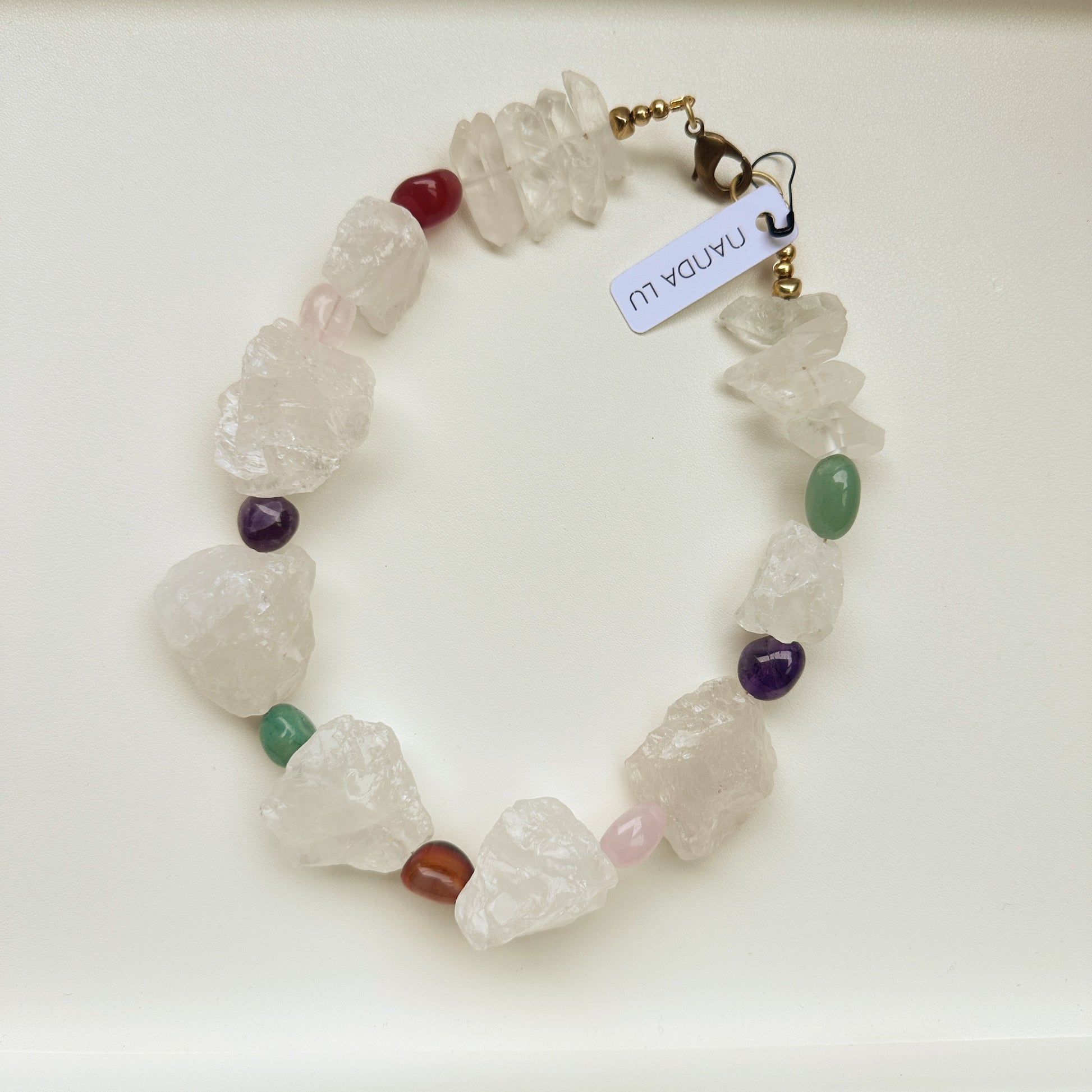 Chunky Chrystal nuggets and mix-color stones pebbles. Brass claps.