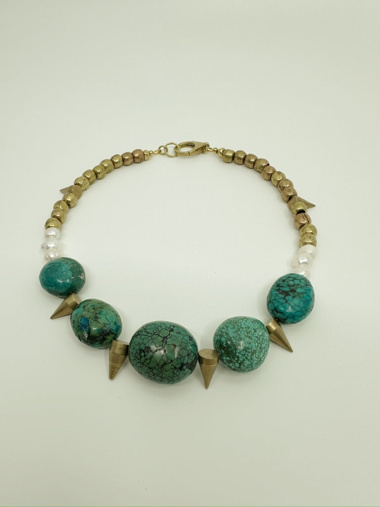 Turquoise, pearls, brass.